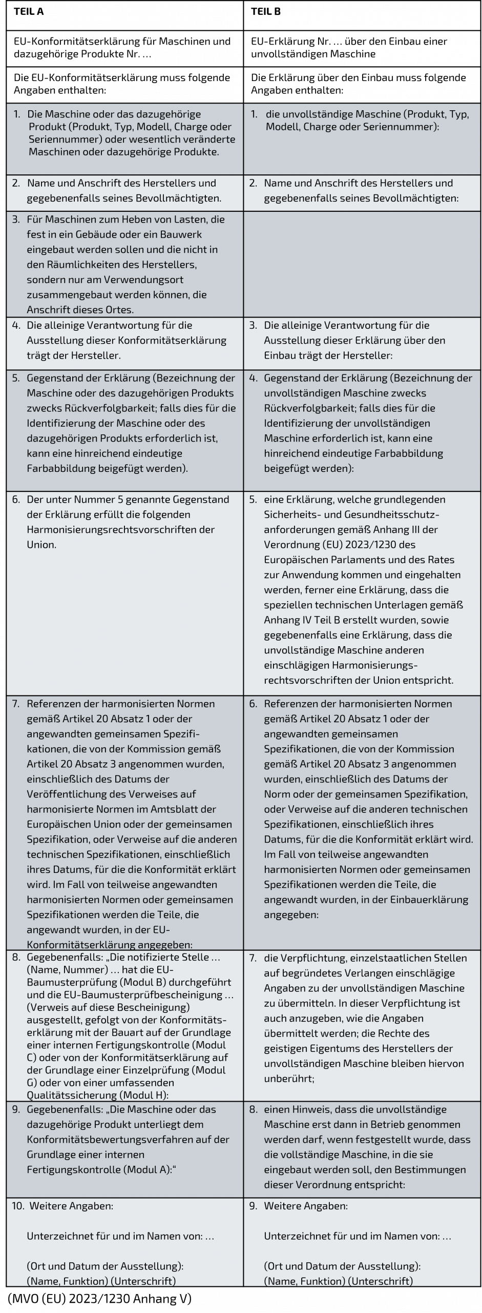 In Anhang V der MVO werden Inhalte für das Erstellen von Konformitätserklärungen (Teil A für Maschinen und dazugehörige Produkte) und Einbauerklärungen (Teil B für unvollständigen Maschine) gefordert (siehe Tabelle Textende).